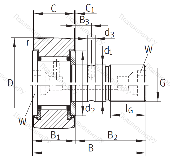 Подшипник KR 35 PP A его конструкция практически полностью повторяет роликовые подшипниковые системы за исключением наличия втулки, которая является одновременно дорожкой качения, выполняя тем самым функцию отсутствующей внутренней шины (движение осуществляется по утолщенной головке стержня). На поверхности детали находится смазочный канал, через который осуществляется обслуживание (загрузка смазочного материала). Наружная шина утолщена и имеет сферическую (выпуклую) форму. Может комплектоваться игольчатыми роликами или другими подшипниковыми телами.